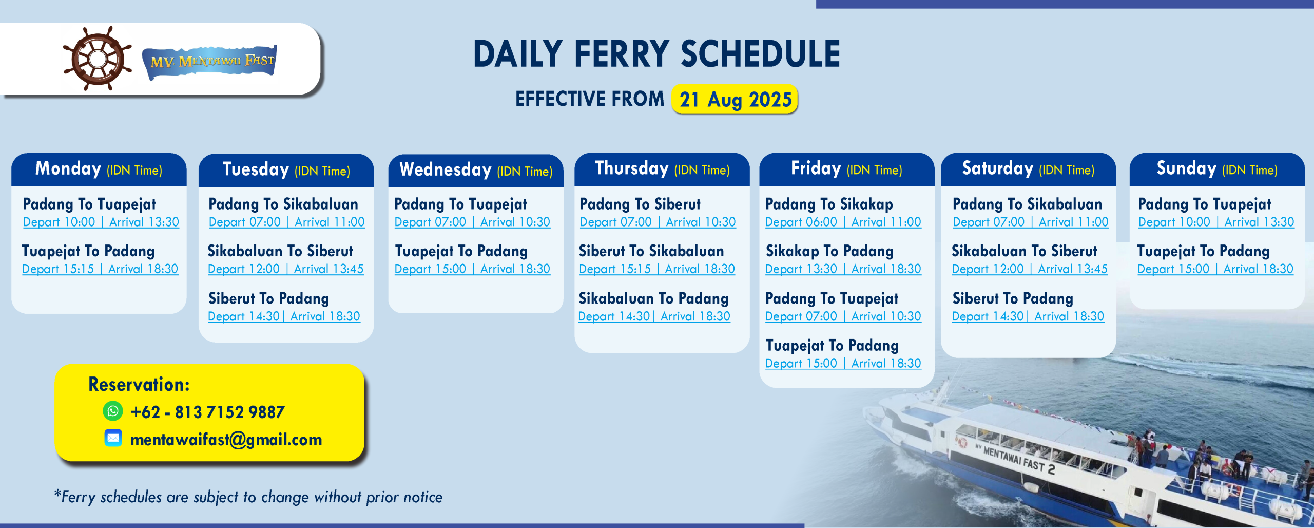 Experinece the Ultimate Island Escape with Mentawai Fast Ferry. Embark on a seamless journey to paradise with Mentawai Fast Ferry service to Mentawai (Tuapejat, Sikabaluan, Siberut, Sikakap) Mentawai’s idyllic island getaway. Whether you’re seeking adventure, relaxation, or simply a change of scenery, our convenient and efficient ferry service offers the perfect way to reach this tropical oasis in on time.
