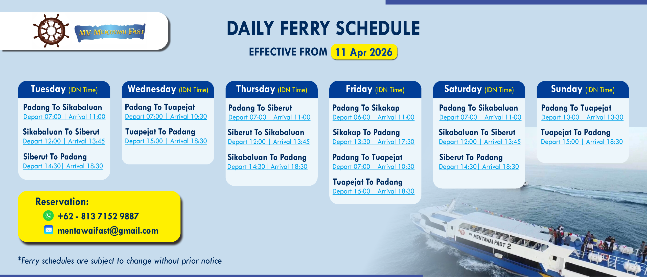 Chat with us (general enquiry or reservation) on Whatsapp Available everyday from 07:00 – 17:00 (WIB)